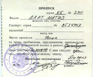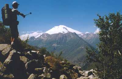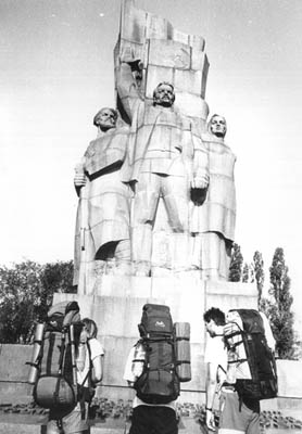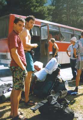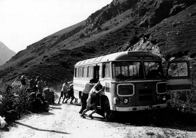 V pondělí vyrážím s Péťou k vojákům pro propusk. Od osmi čekáme před vrátnicí, jsou tu asi dvě party Ukrajinců a jeden autobus Moskevskejch alpinistů. Otvírají v deset. Jako cizince nás nevpustili dovnitř, takže jsme si museli vymyslet maršrut (kudy kam chceme chodit), kterej jsme předali ruský kolegyni, která nám ho donesla k potvrzení. Spěcháme zpět na nádraží, loučíme se s posunovačema, každýmu nám nalili dva stachany vodky, a honem rychle na autobus. Slunce pere, je mně šoufl. Nasedáme do dálkovýho Ikarusu Nalčik - Baksan - Tyrnyauz - Elbrus - Těrskol. Asi 20 minut po plánovaným odjezdu nám řekli, že kdo nemá v kase koupený lísky, ať vystoupí. Nechápeme. Bágly prej máme nechat v busu, lístky si nemáme kupovat. Pro jistotu necháváme v atobusu i Lílu, zbylí tři vystupujeme a jdeme s davem za roh atobusáku k zastávce MHD. Po chvilce přijíždí i náš autobus, nastupujeme a frčíme do hor. Pro koho jsme hráli tohle divadlo chápeme až tehdy, když platíme 23 rublů (35Kč) při vystupování ve 160 km vzdáleném Elbrusu řidiči na ruku. |