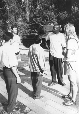 V neděli (25.7.) ráno nás zkontrolovala policejní hlídka (přece jen je nádraží strategickej objekt). Bágly necháváme u nádražáků, vyrážíme do města a uzavíráme sázky, kolikrát nás dneska budou legitimovat. Nevyhrál nikdo, dál už jsme totiž (až na focení parlamentu) neměli s policií žádnej problém. Prošli jsme si hlavní třídu, cestou dali maroženoe, v kanceláři aeroflotu jsme si vyměnili 120 $ a v univermagu koupili svačinu. S tou jsme se poprali v parku naproti horní komoře parlamentu KBR. Ve vidině budoucího strádání jsme si dali kulatou koblihu s rozinkama, šestikilovýho melouna, trojhránek s tvarohem, kefír, chleba a dvou a čtvrt litrovou PETku piva. Potom jsem v zábavním parku vyhledal podzemní tureckej záchod, dokonce s automatickým splachováním a mytím nohou zároveň. Během prohlídky atrakcí parku a hledání narzanu, jak se zde říká minerálním pramenům, jsme spořádali další ruskou zmrzlinu. Při další prohlídce jednotliví členové expedice odbíhali do křoví. Povečeřeli jsme endiaron s živočišným uhlím a asi do půl noci klábosíme s třetím posunovačem. |