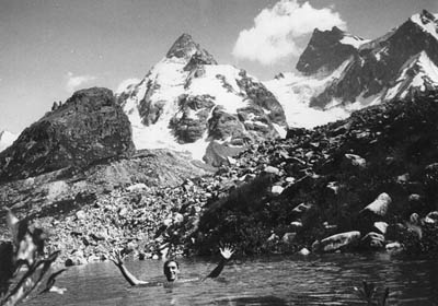 Je to zážitek. První pohledy na zasněžený velikány, burácení motoru přerušované výkřiky mladých horalů. Náda naždať šýpkosť, huláká kdosi z davu když motor už nemůže a šofér loví nižší převodovej stupeň. Míjíme dělo na odstřelování lavin. Najednou chcípnul motor. Rozjíždíme se na zpátečku. Po zařazení první nepřemožitelný ujedeme asi 20 m a motor opět vypovídá službu. Benzina nět, konstatuje řidič. Svůj výrok kontroluje pohledem do nádrže. Vystupujeme, tlačíme autobus mimo cestu, řidič bere pětilitrovej kanystr a vyráží vzhůru do hor. Už chápeme, proč se platí až při vystupování. Taky nám došlo, že když řidič vyrazil nahoru, Džantugan nebude daleko. Bereme bágly a pokračujeme pěšky. Po necelým kiláku stojíme před chátrajícím hotelem Džantugan. Prej je v rekonstrukci. Na druhým břehu dravý ledovcový říčky Adyl-Su (v balkarštině klidná, krásná řeka) se v borovým háji rozprostírá stanovej kemp. Stavíme stan, Péťa kupuje od pastevců 2 chleby a čerstvě nadojený mlíko. Škoda, že nemůžu ochutnat. Večeřím chleba s endiaronem, zapíjím to hořkým čajem. Ráno se balíme k velký túře. Bereme jen věci, který budeme potřebovat, zbytek (a není toho mnoho) necháváme u ruskejch kolegů. V půl druhý vyrážíme na lehký aklimatizační výstup na Bžeduch (Lumír Pecold, ing., kniha Kavkaz). |