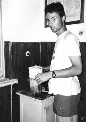 Za pomoci policajta z nádraží se nám podařilo sehnat nocleh u stážního domku přímo na nádraží. Za dobu našeho pobytu se tu vystřídali tři posunovači, každej se hlásil k jiný národnosti, ale všechno fajn chlapi. Hlavně Péťa s nima po večerech fest diskutoval. Během vaření jsme načali Sovětskuju vodku, byla teplá, ale byla. Po večeři přišla vhod teplá sprcha a pokec s posunovačem. |