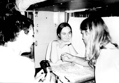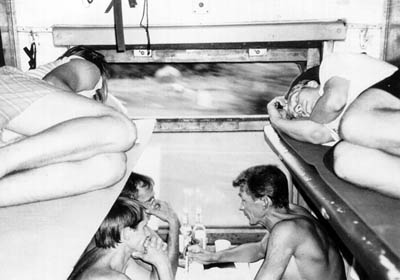 Ze zkušeností jiných expedic víme, že se za povlečení v plackartnych vagónech platí. Ptali jsme se místních, říkali že 13 rublů (Ukrajinci říkaj hřivně rubl, takže by to dělalo 104 Kč na osobu). Taky ale víme, že jde dežurnyho ukecat a spát na vlastních karimatkách, poř. spacáku (to by se ale muselo tak o 20° ochladit). Nic nenecháváme náhodě a hned po rezjetí vlaku jdou Péťa s Matějem vyjednávat. Prý něvazmóžno, dokonce viděli i nařízení z ministerstva. Když si Petr vymyslel, že nemáme peníze, jen šeky, jedna Moskevskaja vodka to spravila. Jaký bylo naše překvapení, když jsme se na zpáteční cestě dozvěděli, že to stojí 13 ruskejch rublů, teda 20 Kč. I tak jsme ale ušetřili (asi 30 Kč) a hlavně jsme se tak na hodinku zabavili… |