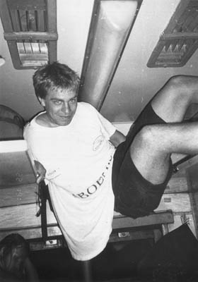 Za tuhletu fotku jsem málem přišel vo foťák. Líla to vzal bleskem, slez z palandy, pak jsem tam vylez já a chtěl to vzít na diák. V tom se zvednul pod Péťou sedící Ukrajinec a chtěl po mě film. Naštěstí pod Matějem sedící vazba byl po těch dvou láhvích vodky (na stolečku) ještě poměrně soudnej, nechal si vysvětlit, že v záběru je jen vršek kupé a kolegu uklidnil (no, spíš přepral…). |