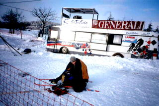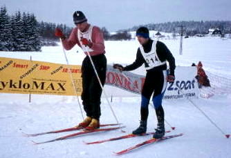 ce teda jede s kolegyní.V poledne máme bejt na startu. Je třičtvrtě na deset, zvoní telefon, Jana volá, že jí nejde nastartovat auto. Do půl hodiny sežene kámošku s náhradním odvozem. Po hodině čekání volá, že jsou někde na půl cesty v závěji, Véna je běží vytlačit. Je půl dvanáctý a konečně vyrážíme. Na Bedřichov to pěkně klouže, z Bedřichova na Hrabětice je to ještě horší. Cesta je zablokovaná, stavíme. Při pokusu o nastartování nejde startér. Asi to nestihneme. Véna si obouvá starý práskačky a vyráží