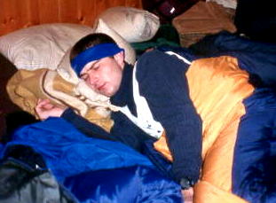 Kolem páté se objevili skuteční obyvatelé pokoje. Přidali se k všeobecnému poflakování a někdo se dokonce i učil. Proč, to se doposud nepodařilo zjistit. Po dvacáté hodině jsme vyrazily do hospůdky. Švestka se Šovinem nám vyprávěli po cestě kde kdo byl zapíchnut a nalezen mrtev a les začínal být hustší a hustší až se vyloupla hospůdka. Párečky, pívečka a konečně i kakao přidali již k tak dobré náladě. No prostě večer se vyvedl. Po běhu na koleje (začalo pršet) mě byla přidělena postel nějakého budoucího judra. S výhledem na prapodivný obrázek. Pokud chcete vědět jaký navštivte výše uvedené pány. Noc to byla hlučná, protože pražští studenti se učí převážně v noci a vydávají u toho šílené zvuky.